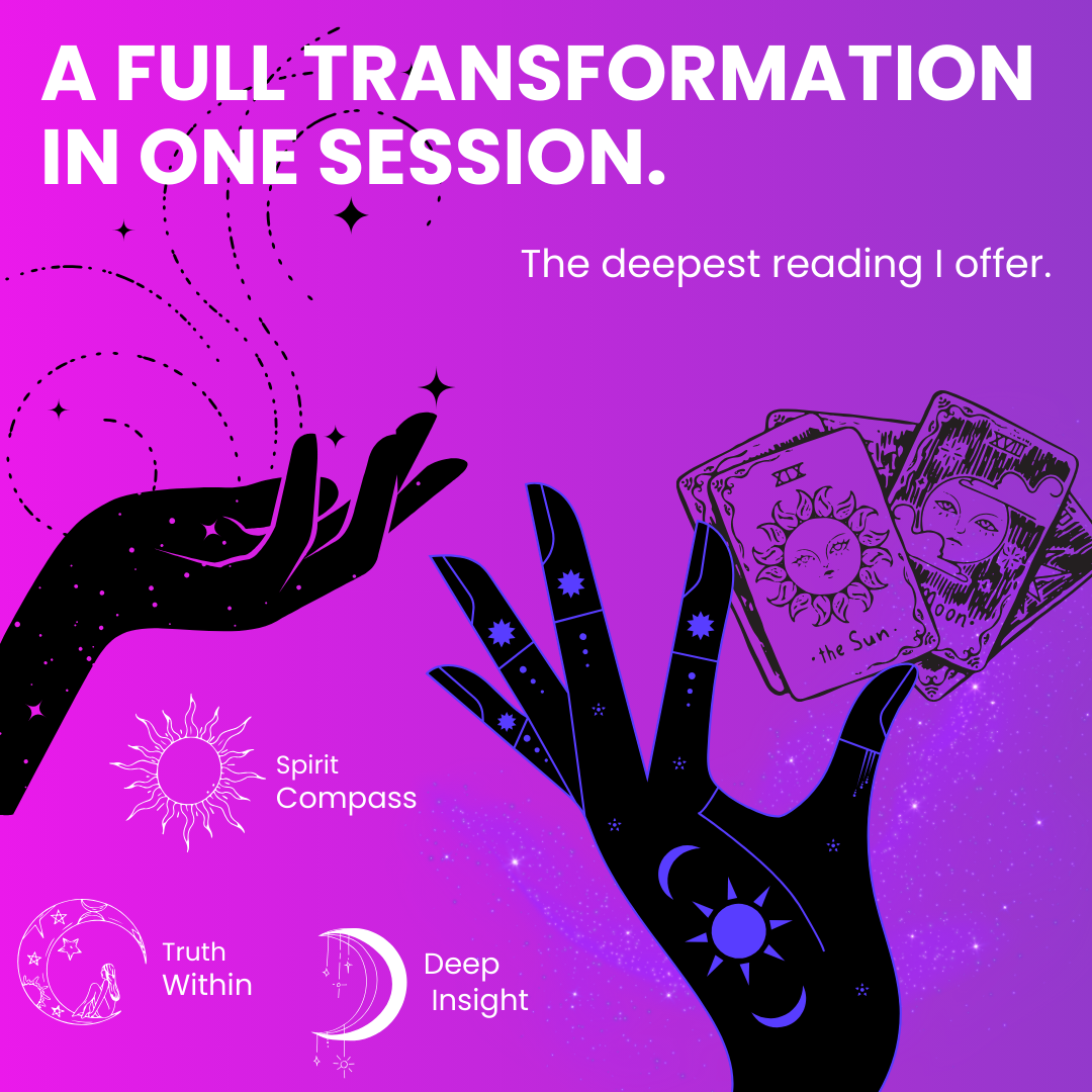 A 45-minute to 1-hour deep-dive video reading covering multiple areas of your life — love, career, spiritual path, blockages, and more. Includes a follow-up email summary AND one clarifying question you can ask after the reading.